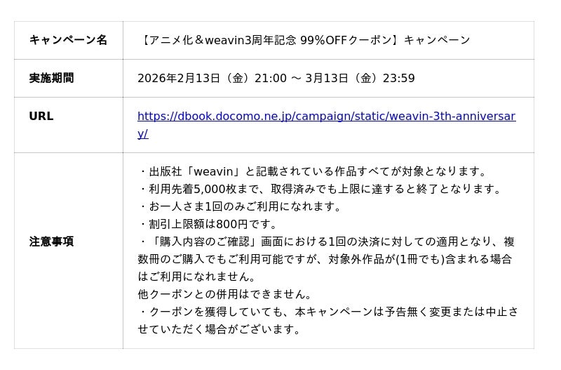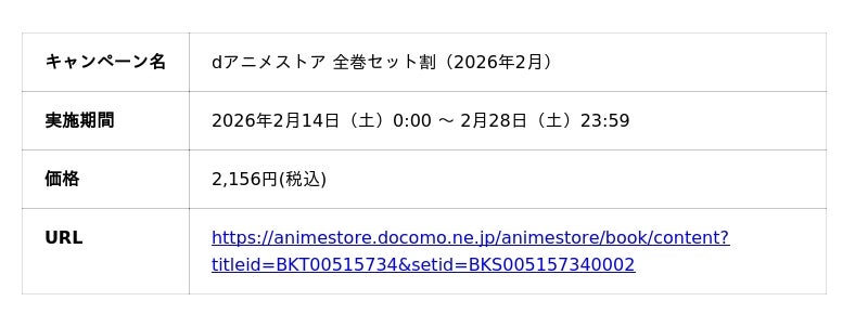 ドコモは、通信サービスにとどまらず、エンターテインメント領域を成長分野の一つと位置づけ、オリジナルコミックの創出からさまざまなメディアへの展開までを一気通貫で推進しています。これにあわせて、アニメ化決定を記念し、「dブック」および「dアニメストア」にて、原作コミックスをお得に楽しめる期間限定キャンペーンを実施いたします。キャンペーンに関する詳細はキャンペーンサイトおよび別紙をご確認ください。